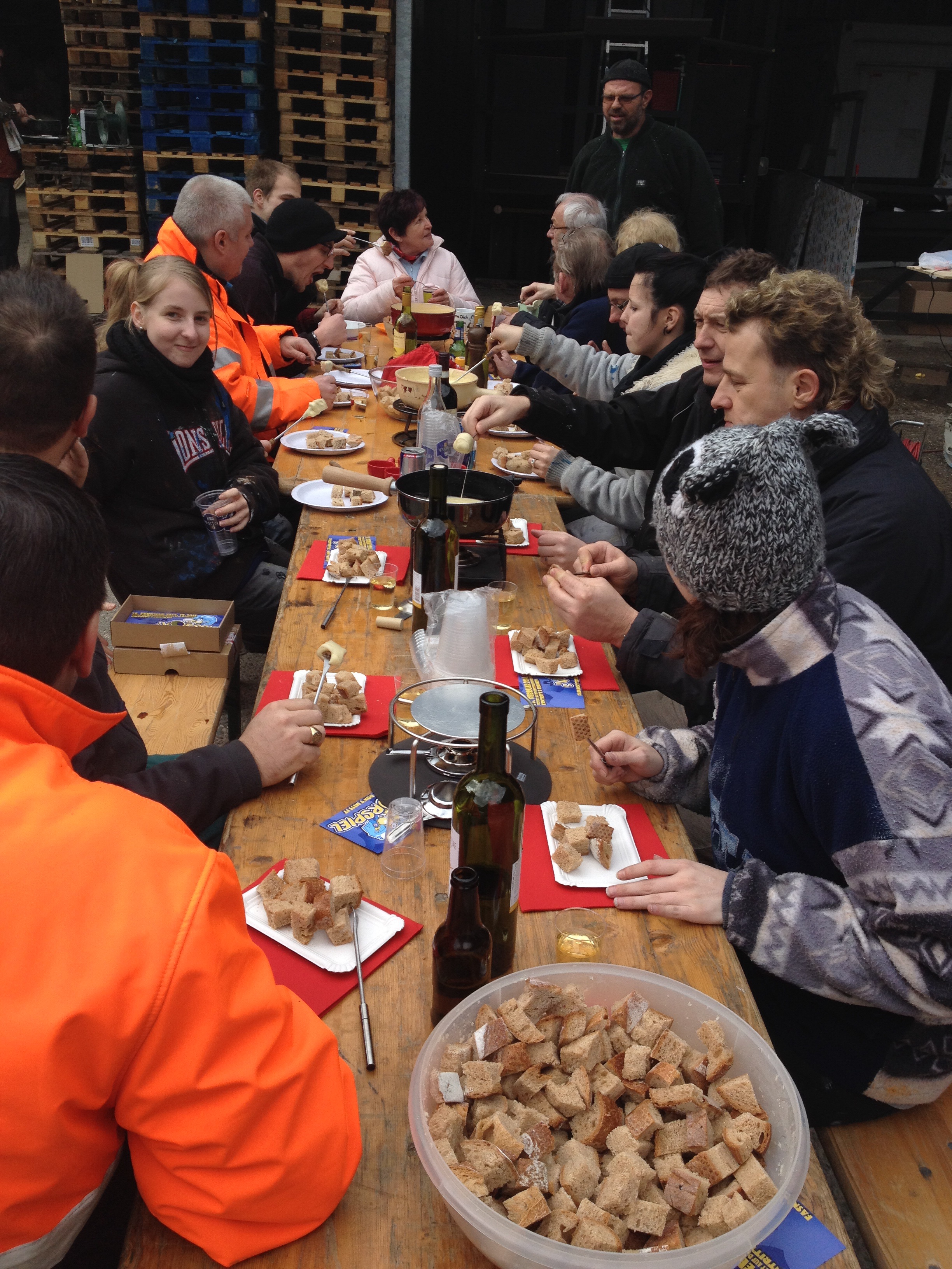 Grosser Einsatz war dann auch beim Mittagessen gefordert, zum Abschluss des Wagenbauens wollen wir gemeinsam mit den Nuschelis Fondue Essen. Es war eine sehr gemütlich Runde und das Fondue wollte nicht richtig „fonder“ (ev. war die kalte Bise schuld) und so assen wir halt Käse gewickelt statt gerührt was der guten Laune aber kein Problem bereitete.